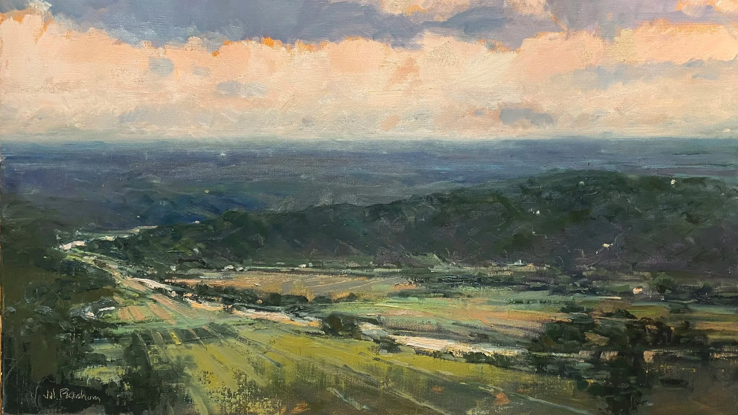 "I am overwhelmed by the beauty of nature, in particular the atmosphere of an environment. Atmosphere is revealed by how the light strikes objects, both natural and manmade. I particularly enjoy the mood of skies and expansive views. Inspiration can arrive anywhere, from a bustling street in Manhattan to an isolated marsh. It's the "feeling" of the place that inspires me, and I hope to translate. When painting a scene, I don't have specific rules for myself. I prefer to let a scene and my feelings for it, set my approach. Palette knives, brushes, household items and hardware store finds have all been used in moving paint onto and around my canvases. I see each painting as an experiment that is unfolding. My initial goal can be interrupted by a new idea during the process, and I'm okay with taking a different path and veering from what might have been comfortable. Of course, there are risks with this, the fear of "failure", and quite possibly a painting that needs to be wiped off...yet that's okay with me. It's the safe paintings that I find less exciting. The truly moving pieces are the ones that I pushed a bit. There are stories to tell. I strive to get my paintings to a point to which I "feel" the place I have painted, and hope others do as well. My hope is that others see and feel the stories I'm telling."