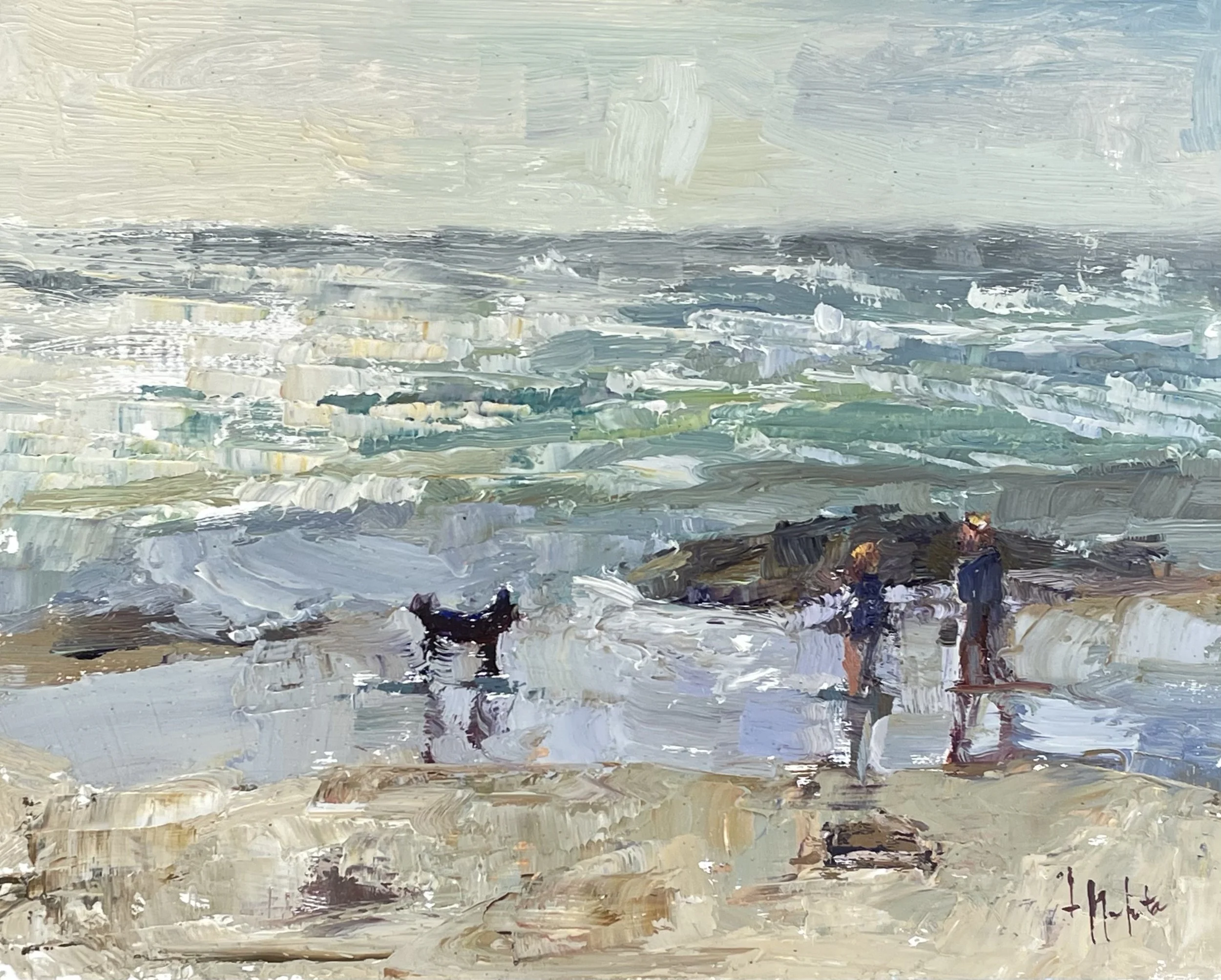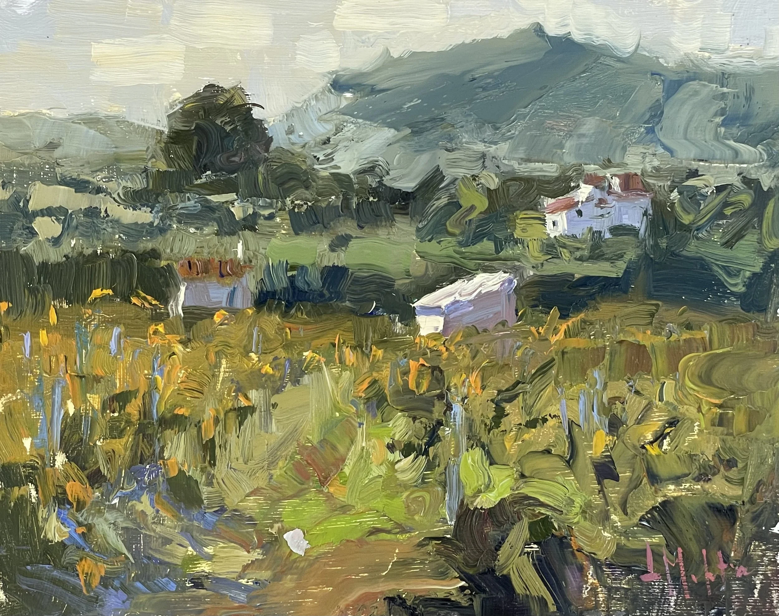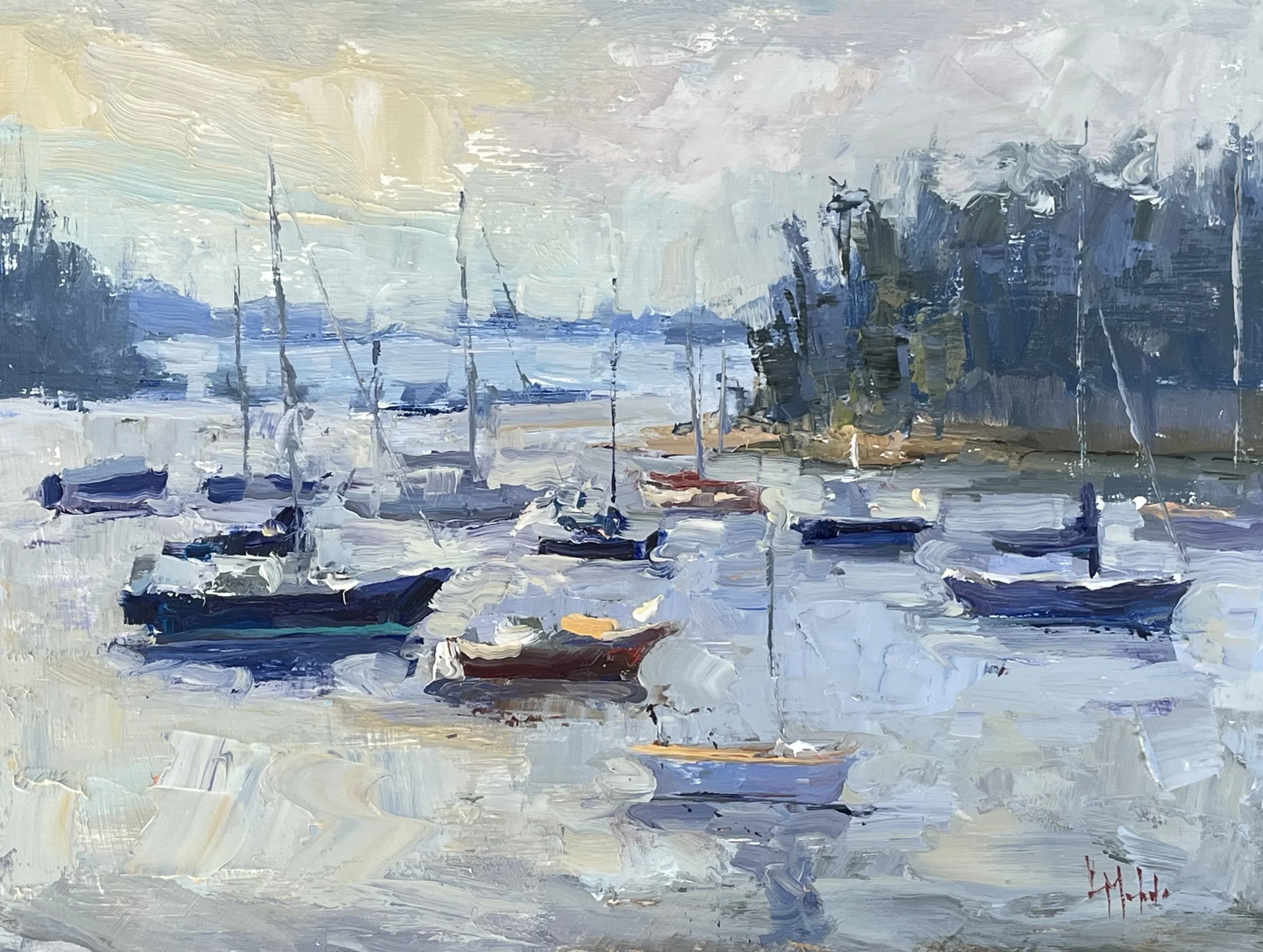 “When I paint I connect with changing light, the color of the landscape, and movement. I focus on abstract shapes and forms creating a whole. The fluidity of oil paint is well-suited to my personality. I enjoy applying it thickly, moving it around as a form of my expression.”